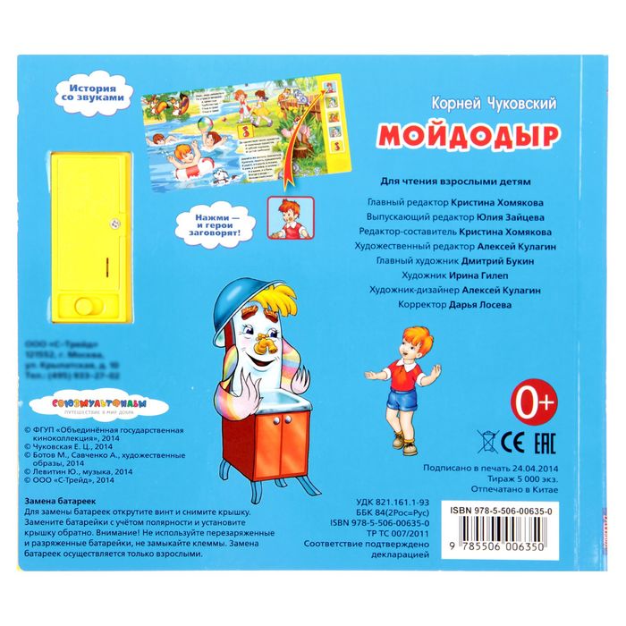 Книга ТМ «Умка» познакомит малыша с известным произведением Корнея Ивановича Чуковского «Мойдодыр». На красочных страницах ребёнок найдёт сказку в стихах и иллюстрации запоминающихся персонажей «Союзмультфильма». А благодаря встроенному в обложку звуковому модулю кроха сможет воспроизвести фрагменты произвденияи песни, которые отмечены специальными парными картинками.