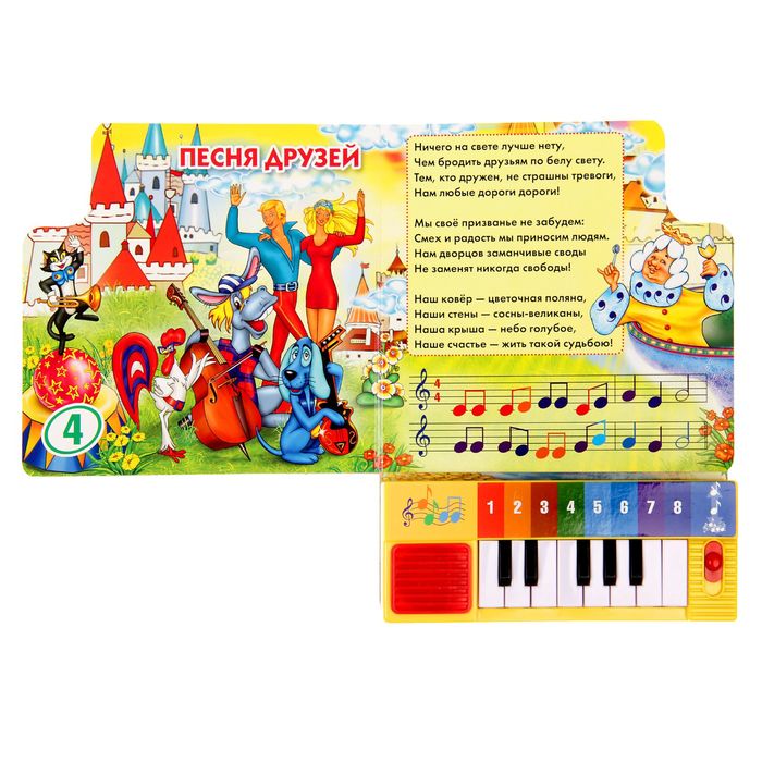 Музыкальная книга-пианино порадует маленьких поклонников творчества «Союзмультфильма». На её страницах ребёнок найдёт красочные иллюстрации с запоминающимися героями, песни, а также ноты с цифрами для игры на клавишах.