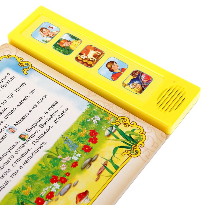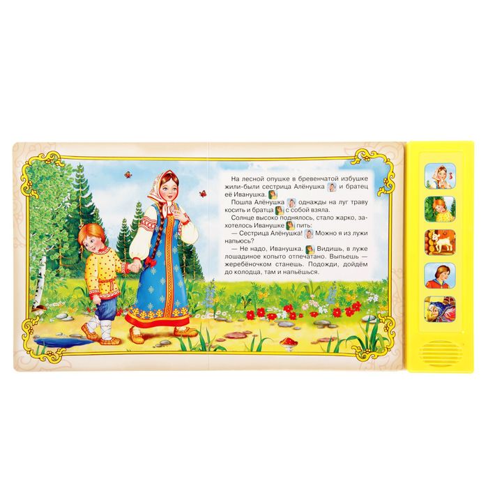 Книга ТМ «Умка» познакомит малыша с известной русской народной сказкой «Сестрица Алёнушка и братец Иванушка». На красочных страницах ребёнок найдёт произведение по мотивам одноимённого мультфильма, а также иллюстрации с запоминающимися героями. Благодаря встроенному звуковому модулю текст оживёт и сделает чтение самым любимым занятием крохи.