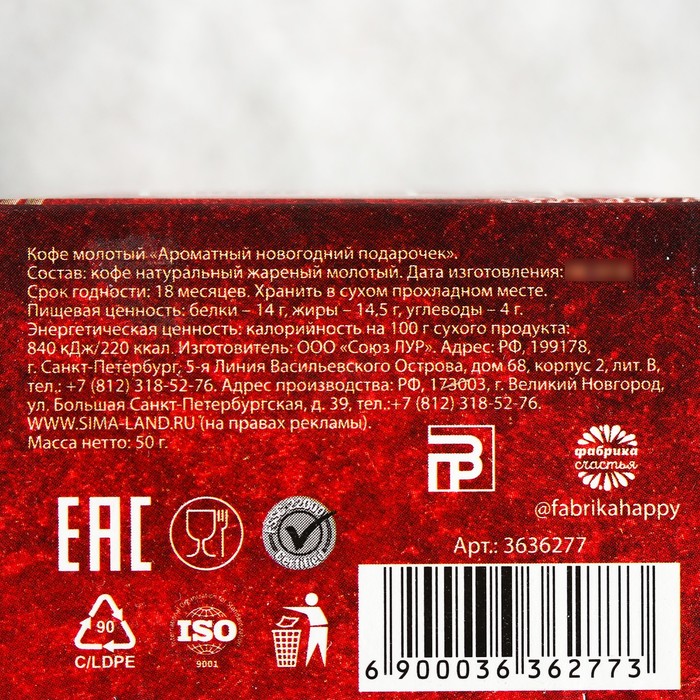 Кофе молотый "Ароматный новогодний подарочек", 50 г обладает насыщенным вкусом и чудесным бодрящим ароматом. Кофеин в правильных дозах способен повышать двигательную активность, умственную и физическую работоспособность.