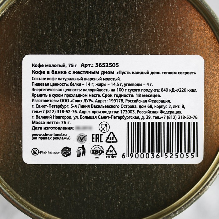 Кофе молотый в банке с жестяным дном "Пусть каждый день теплом согреет", 75 г