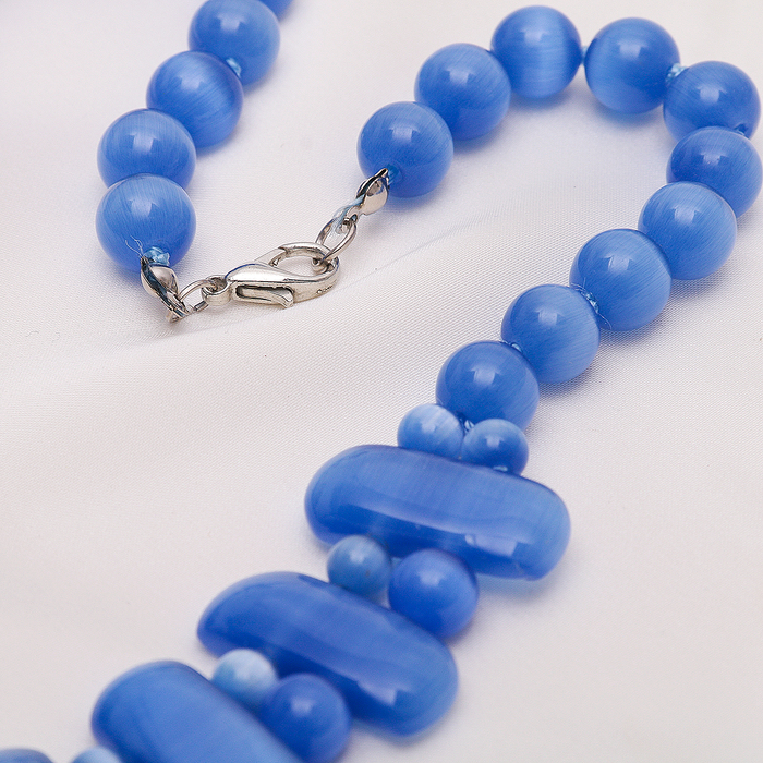 Ни один стиляга не будет выглядеть современно без искусно подобранных украшений, которые завершат его образ! Бижутерия — это современная недорогая альтернатива изделиям из золота и прочих драгоценных металлов. Колье "Кошачий глаз" пластина через шарики, цвет синий, 45 см — это то, что добавит вам шарма!