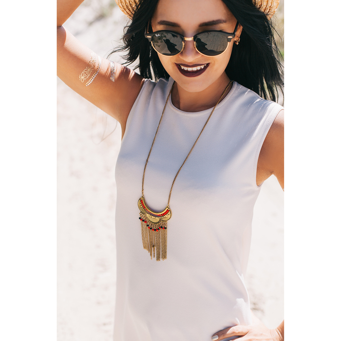 Колье в этническом стиле ― то, что обязательно должно быть в этом сезоне у каждой модницы. Стильная деталь расскажет о вашей индивидуальности. Надев этот аксессуар, вы почувствуете, как вас уносит в тёплые края, где среди пустынных пейзажей неспешно прогуливается як, дожёвывающий свой завтрак.