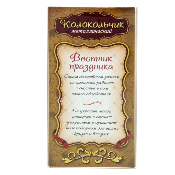 Этот красивый сувенир хочется оставить на видном месте, чтобы он радовал взор своими изящными формами. А еще, если периодически звонить дома или на рабочем месте, то удача повернется к вам лицом, дела пойдут в гору и в жизни станет гораздо больше «белых полос». Колокольчик упакован в дизайнерскую коробку, преподносится с наилучшими пожеланиями от чистого сердца.