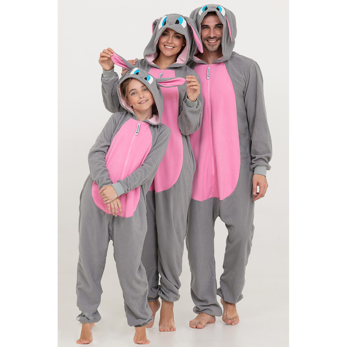 Пижама сочетает в себе два цвета: основной серый и ярко-розовое брюшко. Капюшон украшен длинными ушами и мордочкой зайца с румянцем. Штанины и рукава дополнены манжетами, а сзади — маленький хвостик.