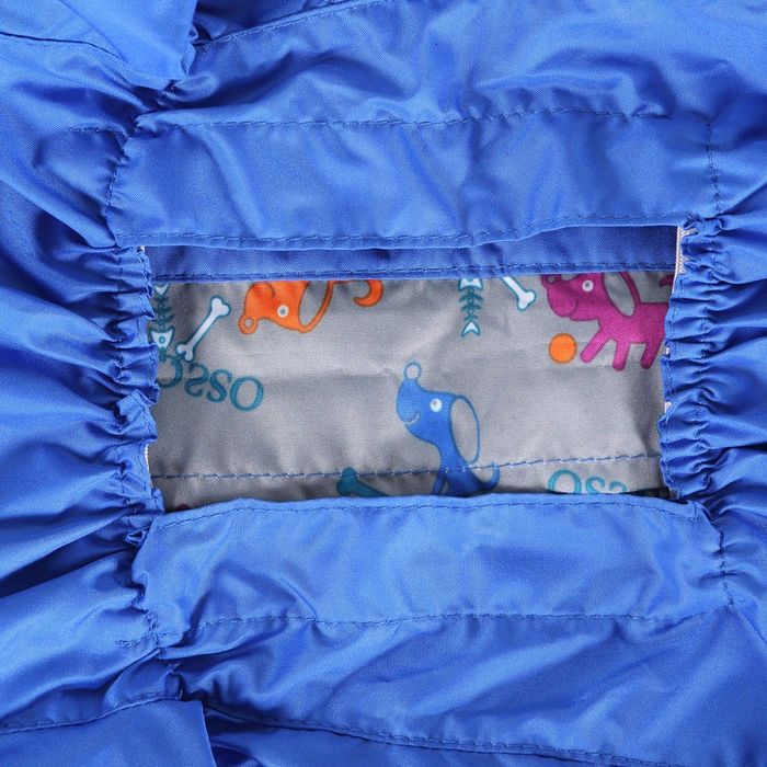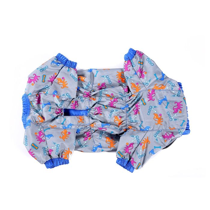 Комбинезон, предназначенный для прогулок в сырую погоду осенне-весеннего периода, выполнен из водоотталкивающей и ветрозащитной ткани. Светоотражающие полосы использованы в отделке двухцветного предмета одежды и на тракторной молнии, чтобы сделать вечерний выгул пса не только комфортным, но и безопасным.