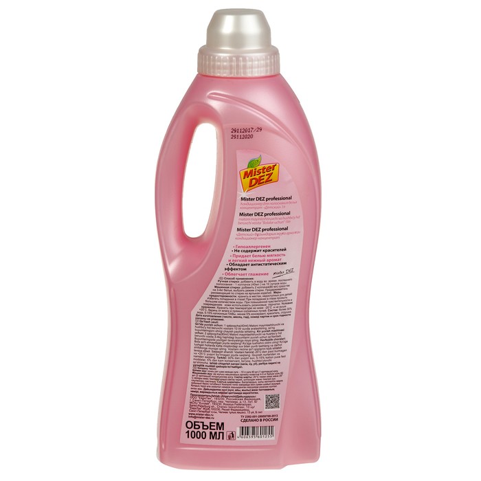 Кондиционер-концентрат для белья Mister Dez Eco-Cleaning Professional Детский, 1000 мл сделает вещи приятными на ощупь и более комфортными в носке. После стирки одежда станет мягче, гладить её будет намного проще. Средство предотвращает образование катышков, не даёт чрезмерно истираться волокнам, а также сохраняет цвет.