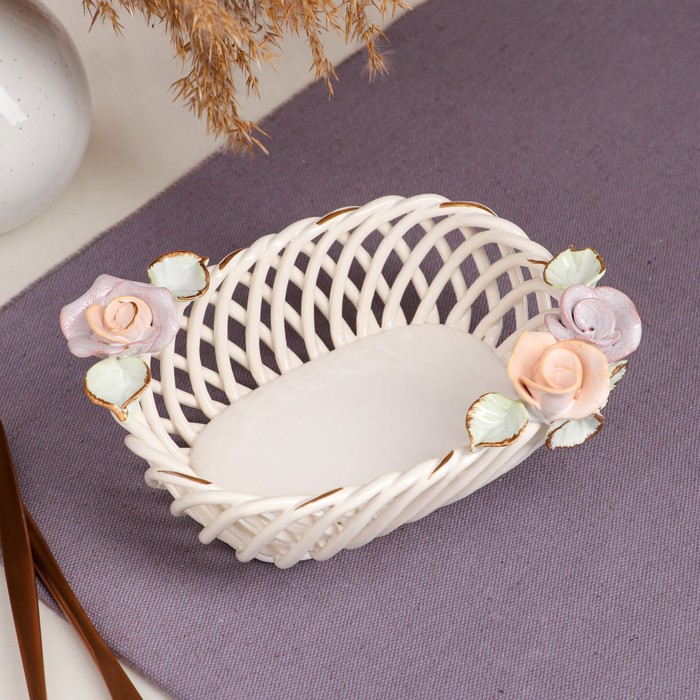 Ваза для конфет выполнена из фарфора молочного цвета. Её стенки декорированы плетением, а дно украшено рисунком. Изделие оформлено изящной лепкой в виде цветочной композиции с золотым обрамлением.