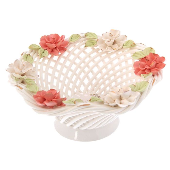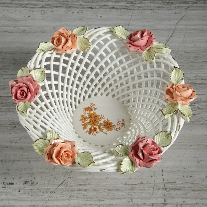 Ваза для конфет выполнена из фарфора белого цвета. Её стенки декорированы плетением, а дно украшено рисунком. Изделие оформлено изящной лепкой в виде цветочной композиции с золотым обрамлением.