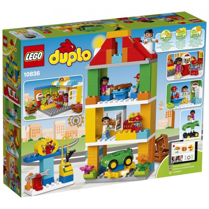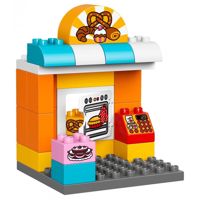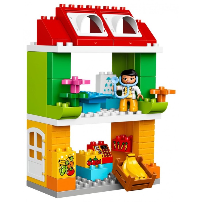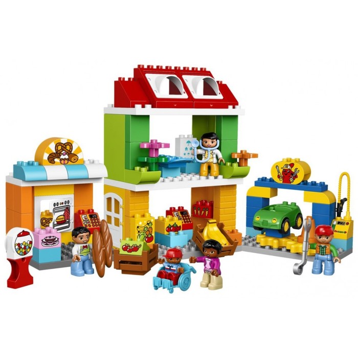 Площадь — самая оживлённая часть городка Duplo. Здесь в пекарне ежедневно делают горячие и ароматные булочки, торты и крендельки. В магазинчике по соседству каждый желающий купит свежие овощи и фрукты. Этажом выше врач ожидает клиентов на обследование. А в автомобильной мастерской уже всё готово для починки машин. Всё это — удивительный набор Lego для самых маленьких!