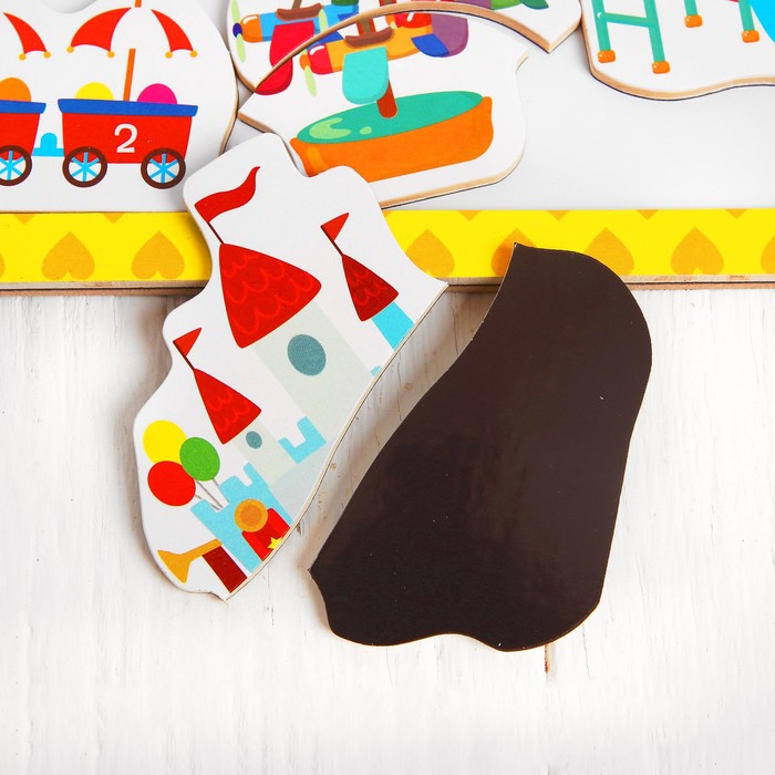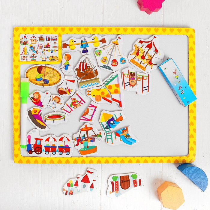 На магнитной стороне малыш составит все фигурки и нарисует фломастером дополнительные детали для завершения картины, например фейерверк, клоунов, продавцов сладостей. На обороте дощечки ребёнок изобразит свою любимую карусель.