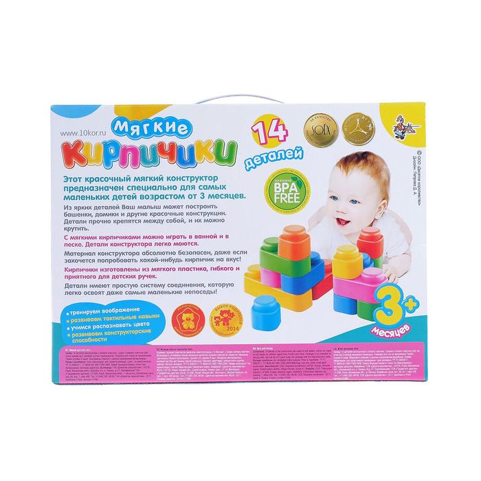 Методы воспитания и образования будут меняться бесконечно, но во все времена постоянным остаётся одно ― радость ребёнка от подаренной ему игрушки. Как известно, счастливая улыбка крохи ― самая большая награда для родителей. Конструктор "Мягкие кирпичики" для самых маленьких, 14 деталей — отличный подарок вашему малышу.
