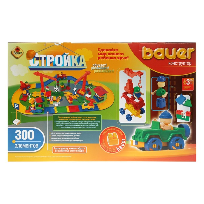 Вся продукция ТМ Bauer изготавливается из гибкого прочного полипропилена, который не причинит вреда ребенку. Элементы окрашены в импортную нетоксичную краску, которая сохраняет яркость оттенков в течение неограниченного периода использования. Собирать конструктор из качественных деталей - одно сплошное удовольствие для маленьких детей. Все части легко соединяются и разъединяются без особых усилий. Наборы из разных серий взаимозаменяемы и дополняемы, то есть конструктор «Стройка», 300 элементов можно дополнить набором из любой другой серии, расширив пространство для творчества.