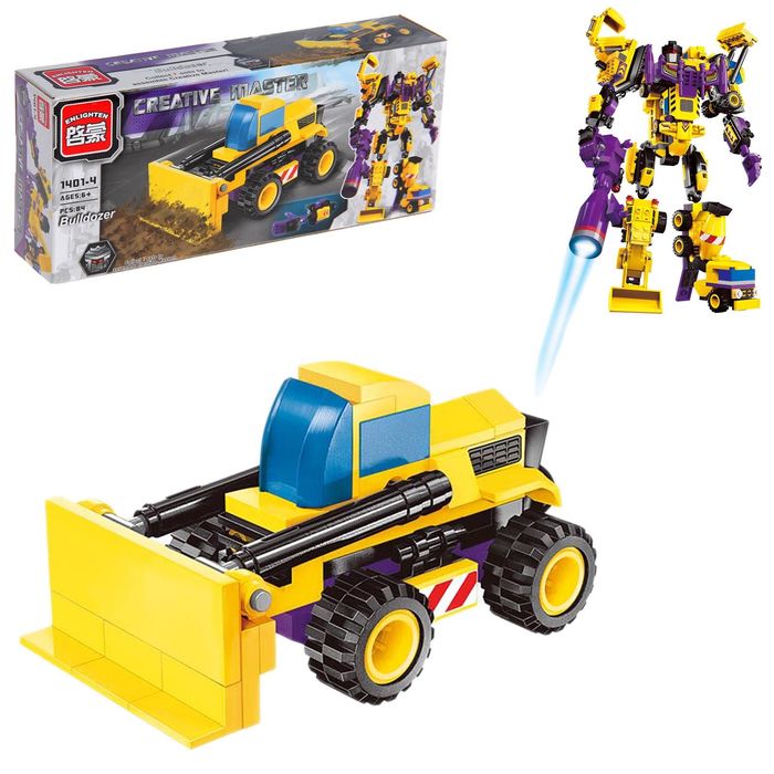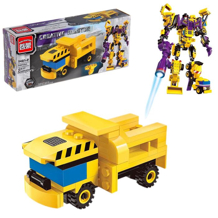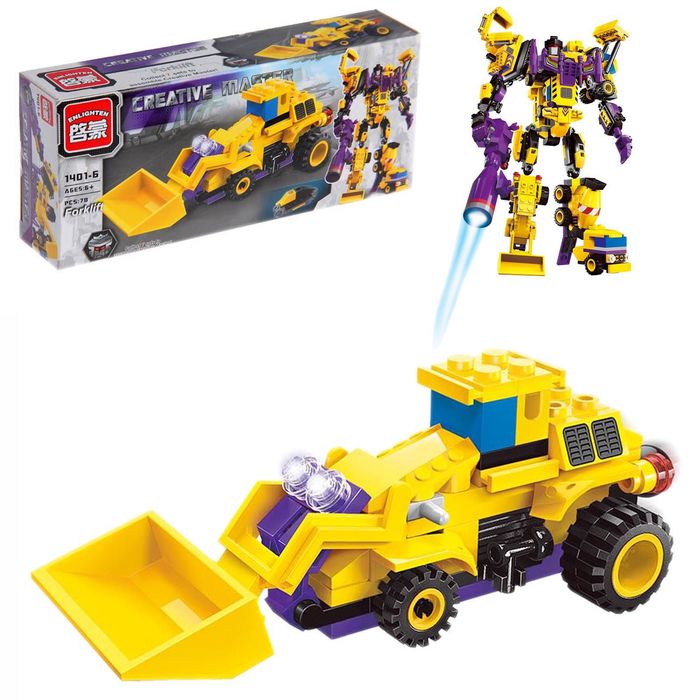 - Набор представлен в комплектации МИКС, содержит от 77 до 107 деталей и позволяет сконструировать один из видов спецтехники: экскаватор, грузовик, бетономешалку, бульдозер. Объединив все модели, получится собрать неуязвимого мегаробота.