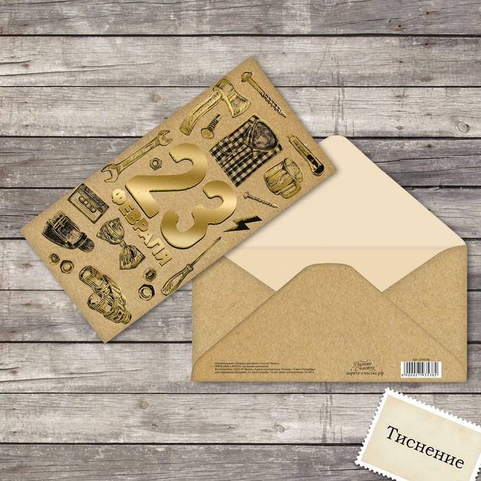 Конверт для денег "23 февраля", тиснение, крафт и атрибуты, 16,5*8см