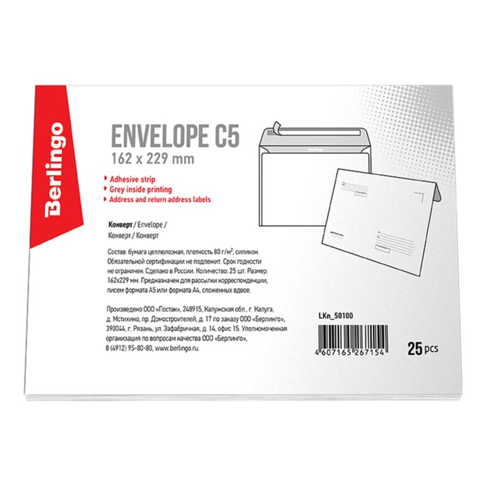 Конверт почтовый Berlingo C5 162х229 мм, без подсказа, без окна, отрывная лента, внутренняя запечатка, термоусадка