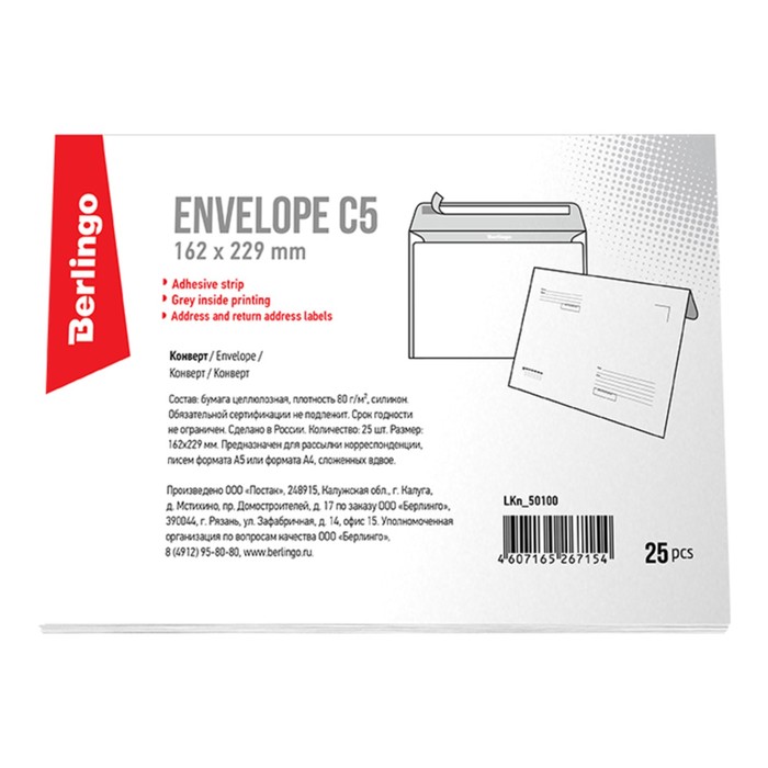 Конверт почтовый Berlingo C5 162х229 мм, с подсказом, без окна, отрывная лента, внутренняя запечатка, термоусадка