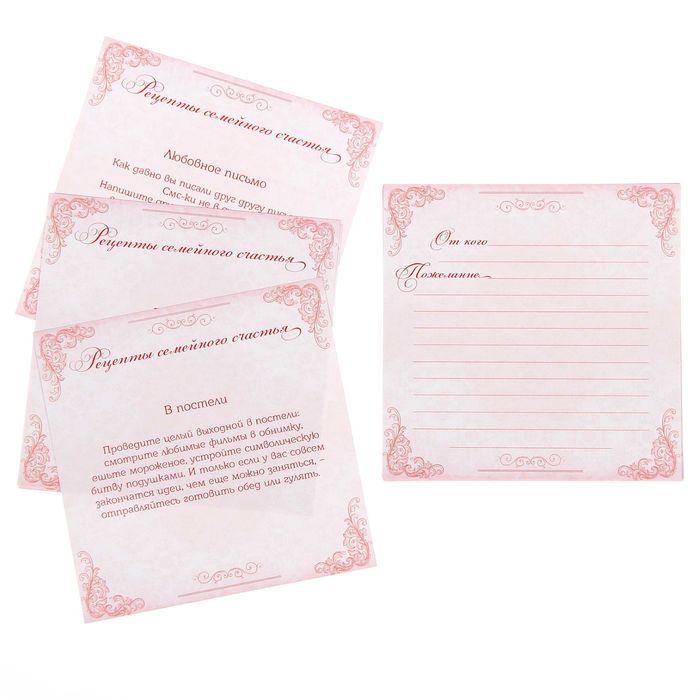 Все карточки украшены оригинальным узором и дополнены полями для имени поздравителя и его тёплых слов. На оборотной стороне написаны секреты семейного счастья для молодоженов. Также к набору прилагается открытка, которую нужно поставить на стол рядом с коробочкой для привлечения внимания гостей.