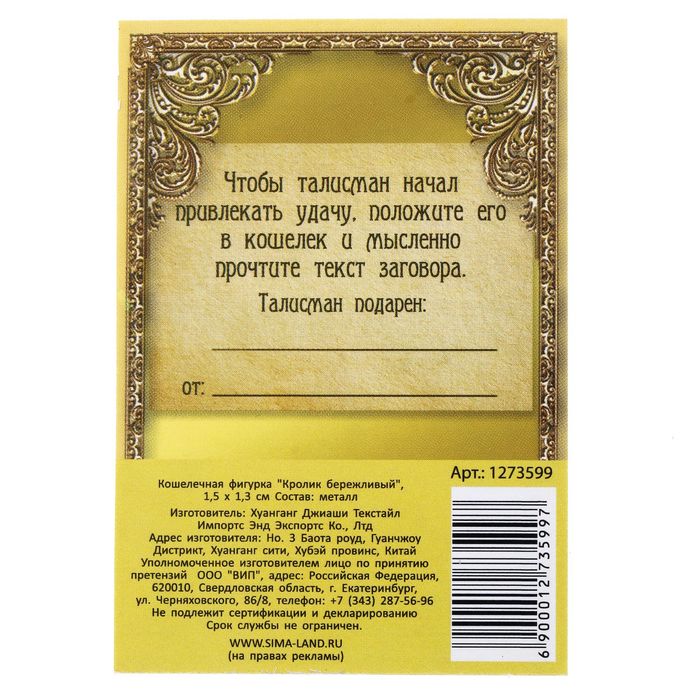 Денежный талисман, расположившись в вашем кошельке, подарит деньги, привлечёт удачу и счастье. Для активации поместите его в портмоне и произнесите заговор, указанный на упаковке. Металлический сувенир весом всего 2 г преподносится на эксклюзивной дизайнерской подложке в пакете с европетлёй.