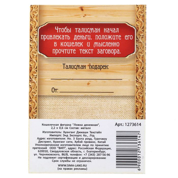 Кошельковая ложка — денежный талисман, способный привлечь небывалый доход. Для активации талисмана положите его в кошелёк и произнесите заговор, указанный на упаковке. Металлический сувенир весом всего 2 г преподносится на эксклюзивной дизайнерской подложке в пакете с европетлёй.
