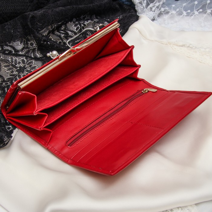 Кошелёк женский, 2 отдела рамка, 3 отдела, для карт, для монет, наружный карман, цвет красный