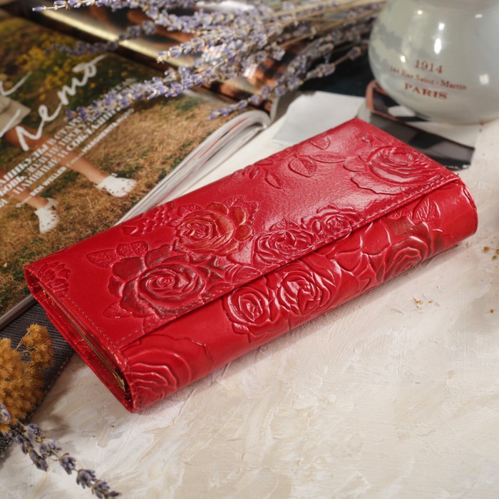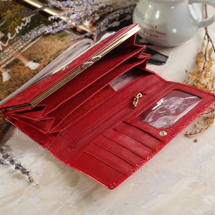 Кошелёк женский, 2 отдела рамка, 3 отдела, для карт, на клапане, наружный карман, цвет красный