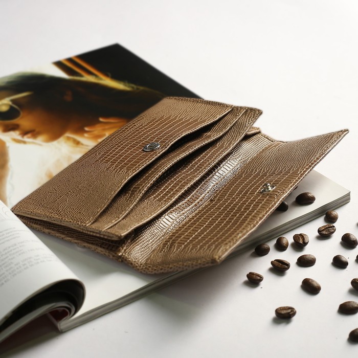 Кошелёк женский, 3 отдела, для карт, для монет, ящерица, цвет бежевый