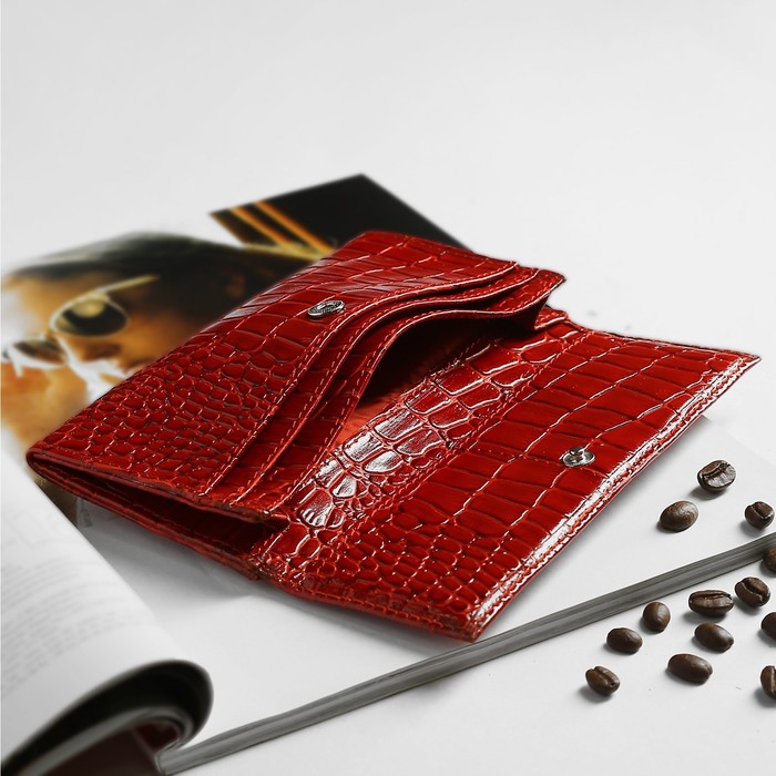 Кошелёк женский, 3 отдела, для карт, монет, крокодил, цвет красный