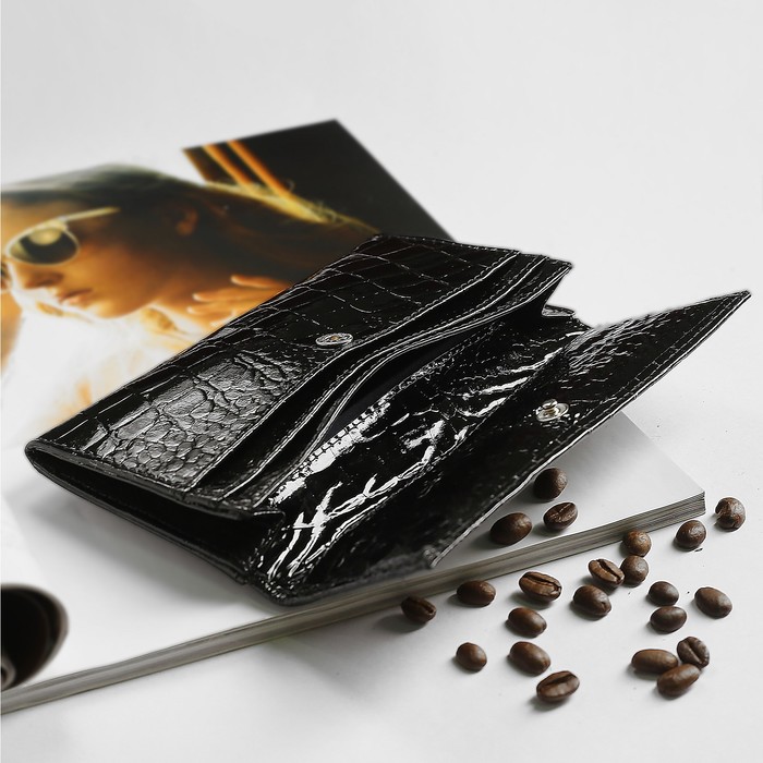 Кошелёк женский, 3 отдела, для карт, монет, крокодил, лак, цвет чёрный