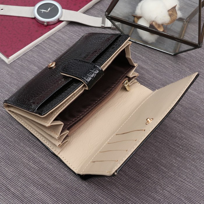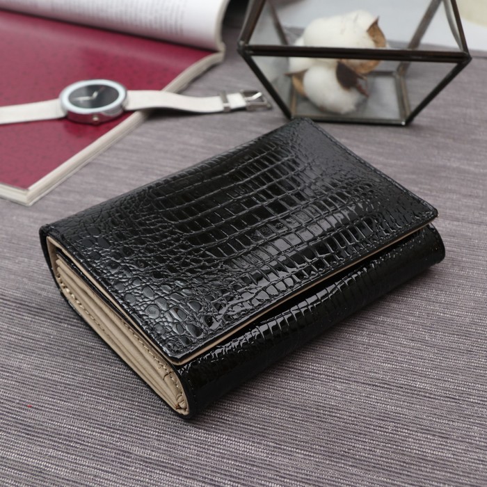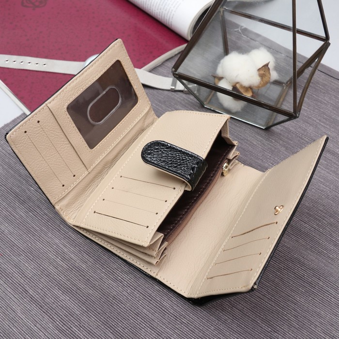 Кошелёк женский, 3 отдела, для монет, для карт на клапане, наружный карман, цвет чёрный