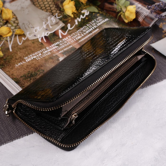 Кошелёк женский, 3 отдела, для монет, для карт на молнии, с ручкой, цвет чёрный