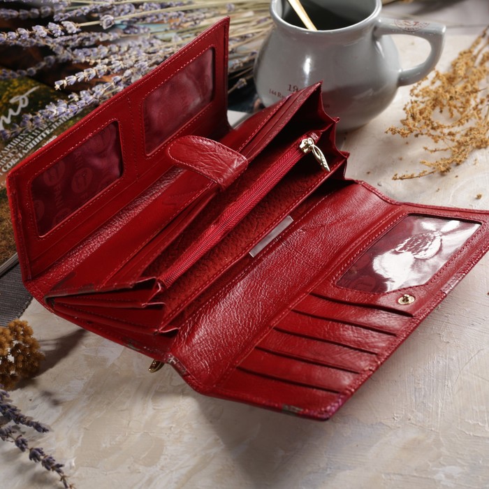 Кошелёк женский, 3 отдела, для монет, для карт, наружный карман, цвет красный