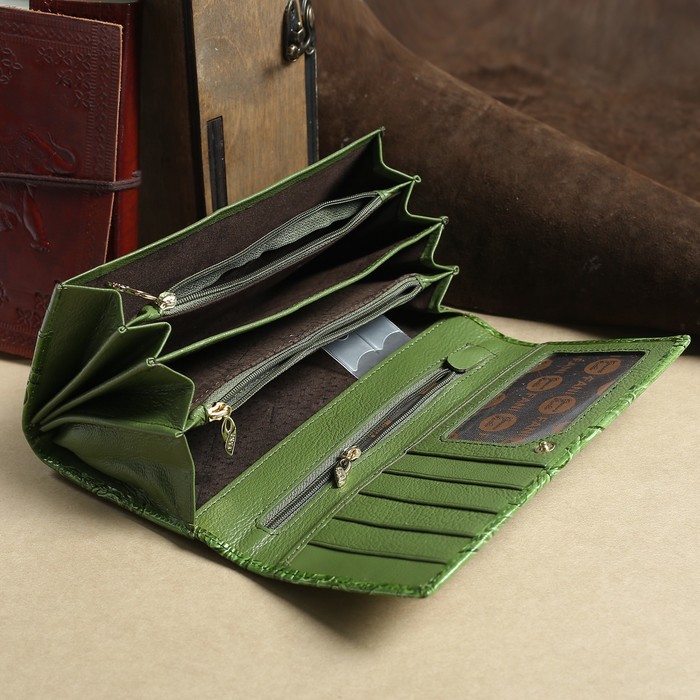 Кошелёк женский, 7 отделов, для карт, для монет, наружный карман, цвет зелёный