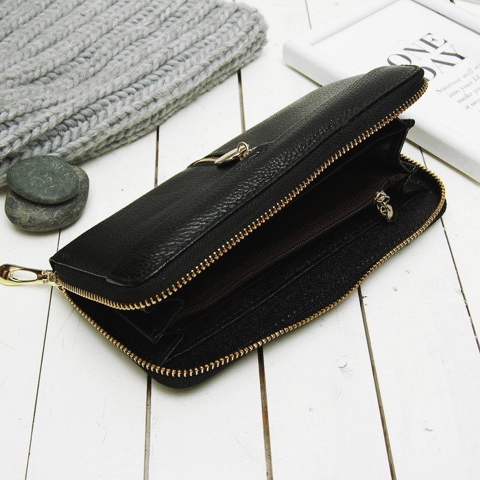 Кошелёк женский на молнии, 3 отдела, для карт, монет, цвет чёрный