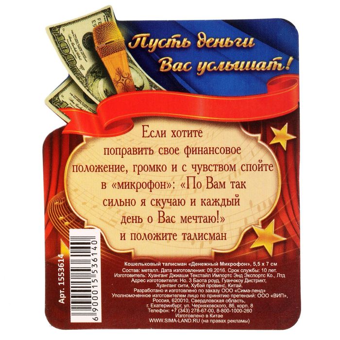 Кошельковый талисман "Денежный Микрофон" — беспроигрышный вариант подарка для близких, друзей, коллег на праздник и просто так, без повода. Предмет привлечёт благосостояние владельцу.