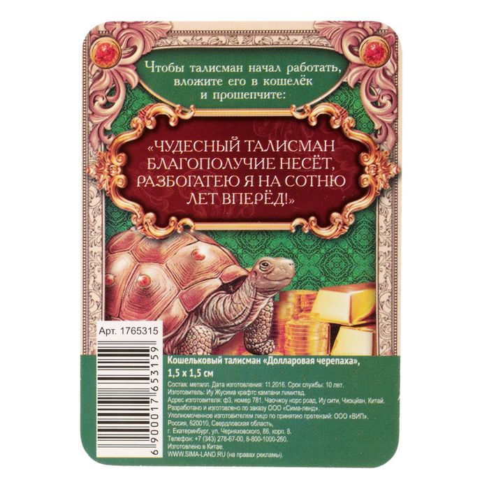 Кошельковый талисман "Долларовая черепаха" — это мощный «магнит» для привлечения денежных средств! Он притягивает материальные блага, защищает их и способствуют приумножению богатства. Миниатюрное изделие легко помещается в отделение портмоне.