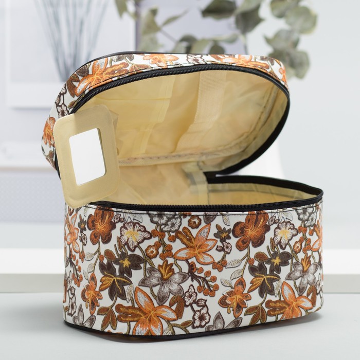 Косметичка-сундучок «Цветы», отдел на молнии, зеркало, цвет коричневый