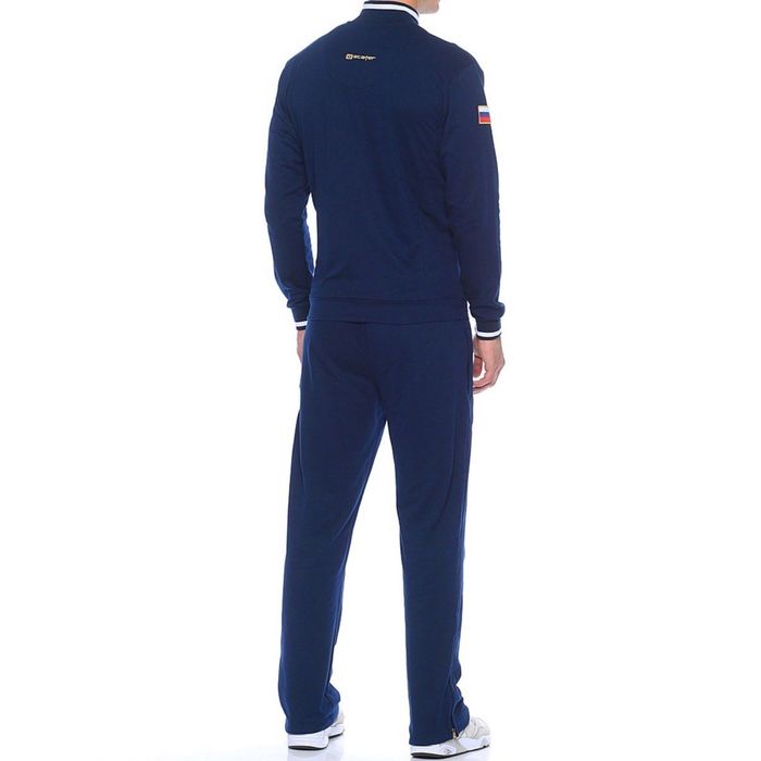 Этот мужской костюм подходит для занятий спортом и активного отдыха, для экипировки команд. Выполнен из трикотажа с подкладкой-сеткой из полиэстера, имеет прямой силуэт, воротник-стойку, манжеты на рукавах и по два внешних кармана на джемпере и на штанах. Пояс брюк посажен на резинку с регулировкой.