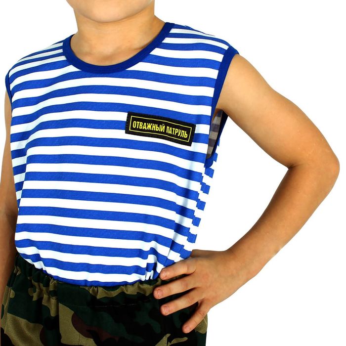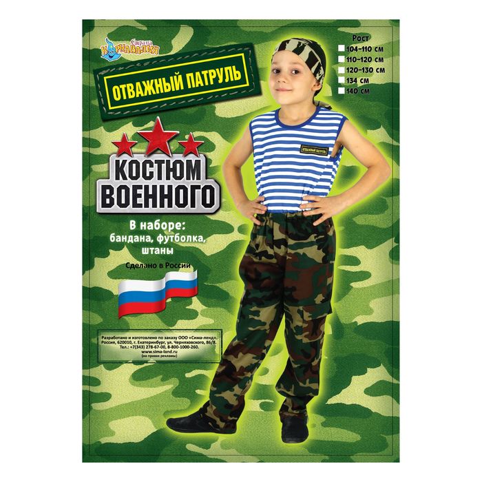 Наряд яркой камуфляжной расцветки в сочетании с полосатой майкой отлично подойдёт для 23 Февраля, Дня Победы — любого патриотичного праздника, выступлений на сцене, тематических представлений или вылазки на природу.