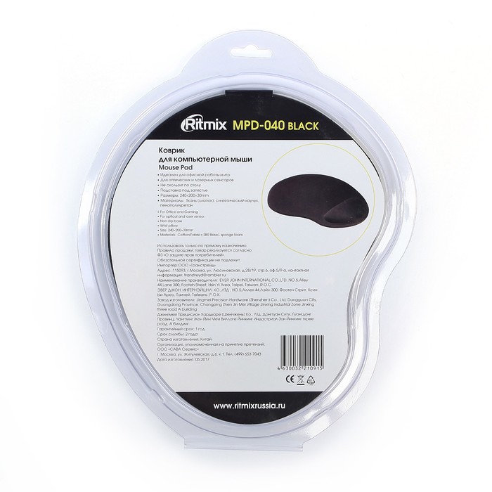 Коврик для мыши RITMIX MPD-040, 220x180x3 мм, черный — аксессуар для вашего стола, который сохраняет поверхность гладкой и защищает её от царапин. Он обеспечивает точность в работе с мышкой и делает перемещение курсора более динамичным.