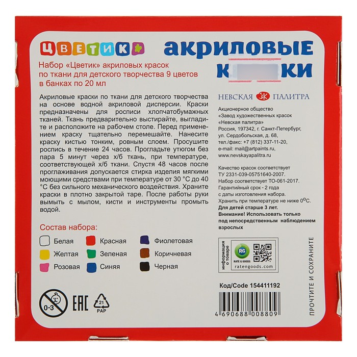 Краска для ткани акриловая набор 9 цветов х 20 мл ЗКХ Цветик 154411192