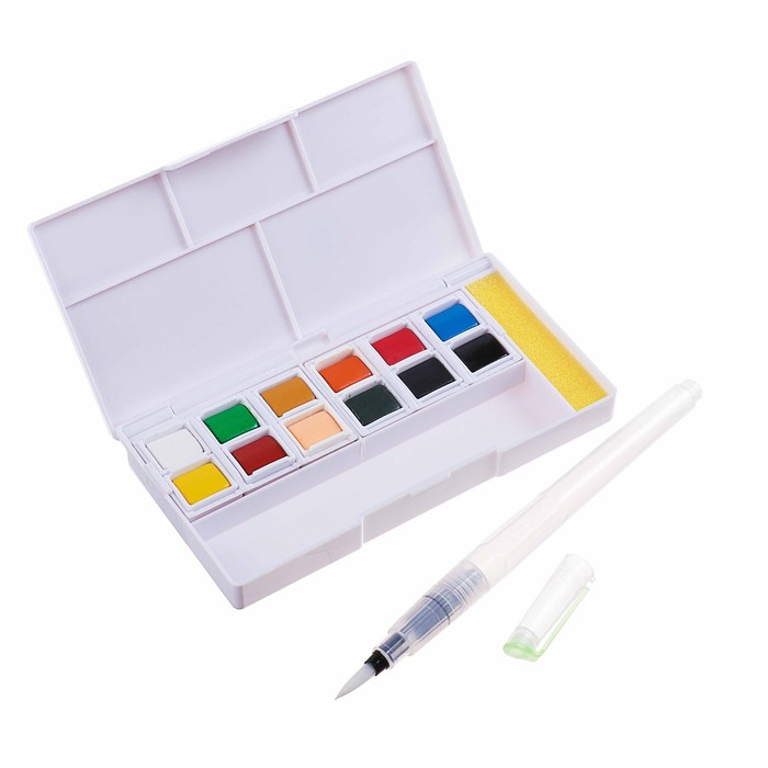 Краски акварельные 12цв в кюветах в пластиковой коробке с палитрой с кистью