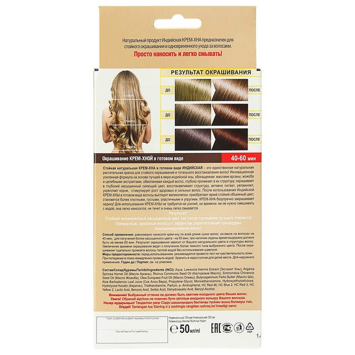 Средство содержит растительные лечебные и красящие компоненты. Они покрывают каждый волос защитной плёнкой, которая задерживает естественную влагу и не позволяет поверхностным чешуйкам пересыхать и топорщиться. В результате волосы не спутываются и легко расчёсываются, становятся шелковистым на ощупь.