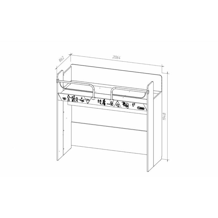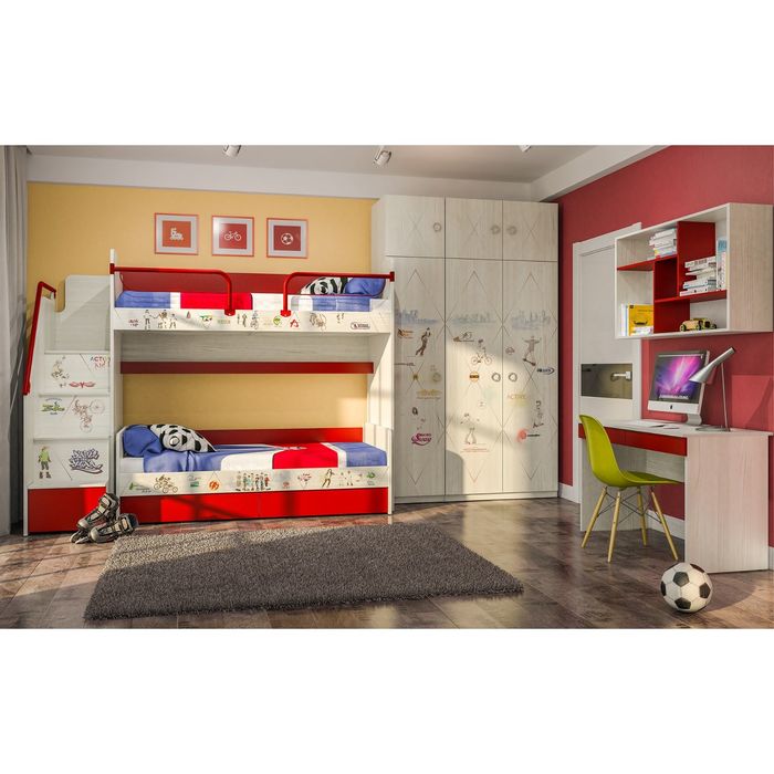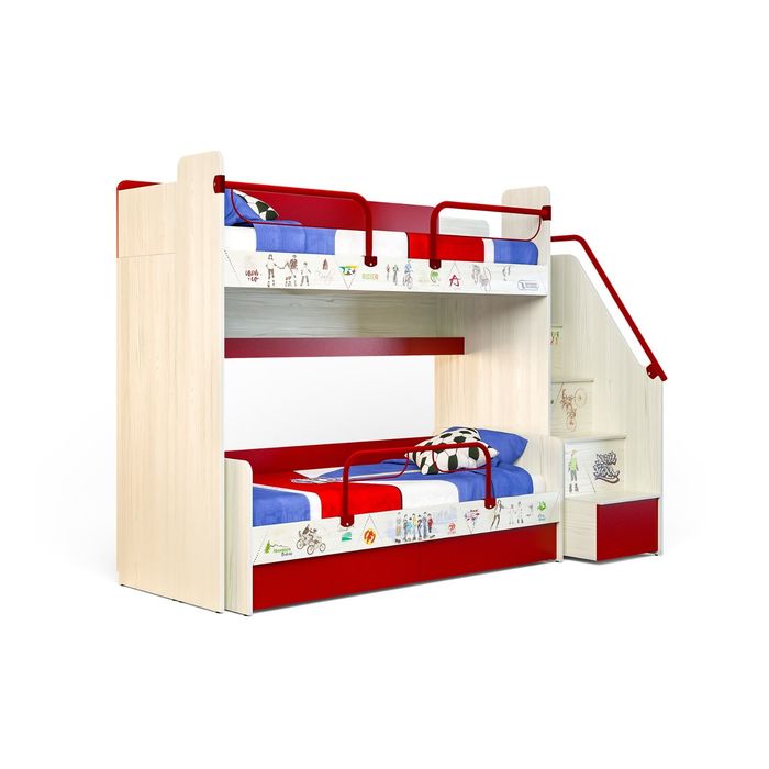 Фасад кровати украшен авторскими рисунками. Модуль поставляется вместе с полкой, дополнительно комплектуется лестницей. Возможна зеркальная сборка.
