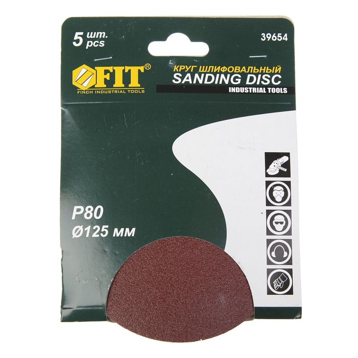Круги шлифовальные сплошные FIT (липучка), алюминий-оксидные, 125 мм, 5 шт, Р80