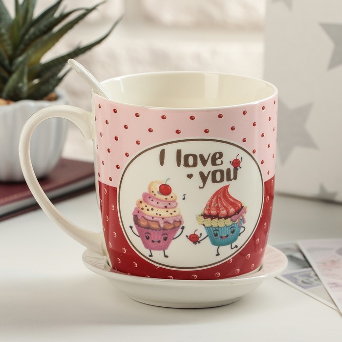 Кружка 320 мл "Капкейк", с подставкой и ложкой, рисунок МИКС
