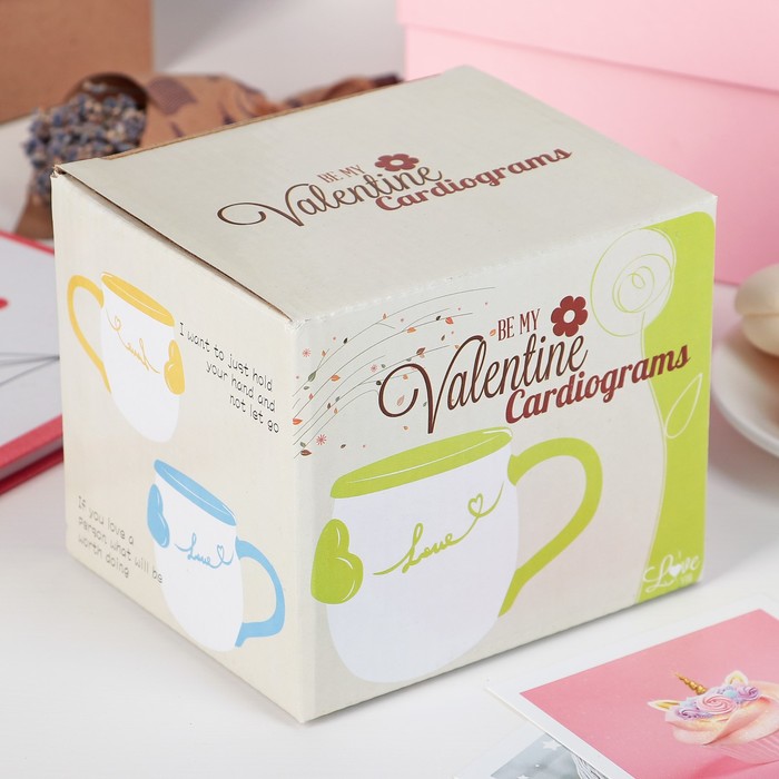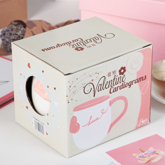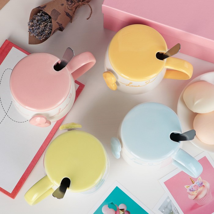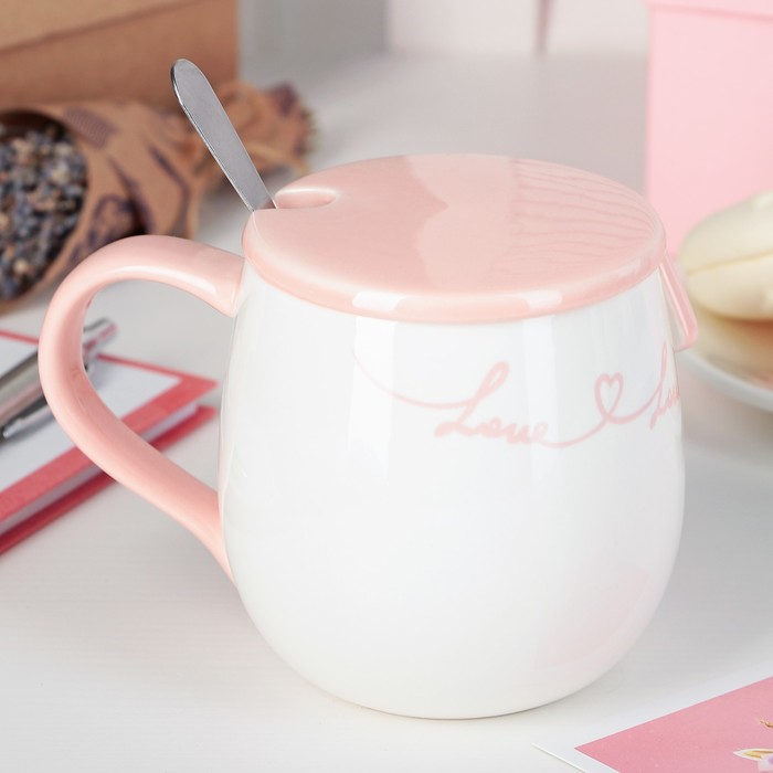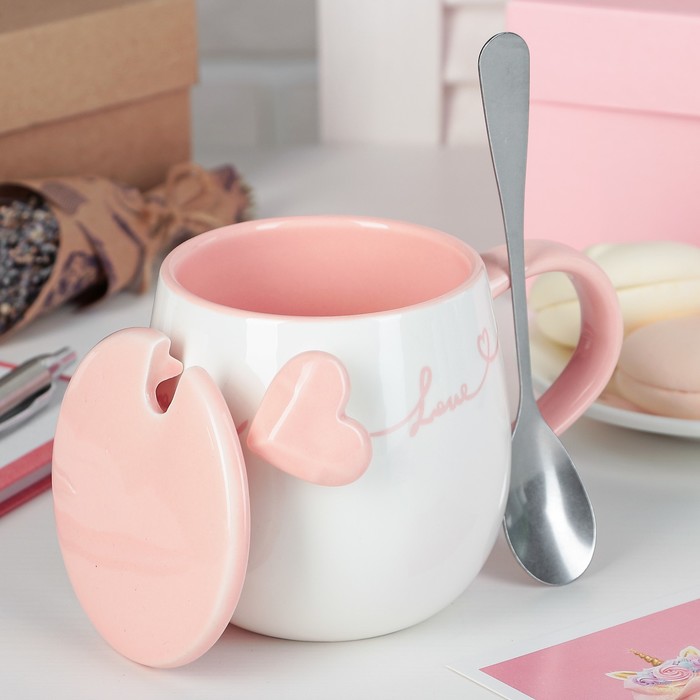 Кружка 400 мл "Биение сердца", с керамической крышкой и ложкой, цвета МИКС