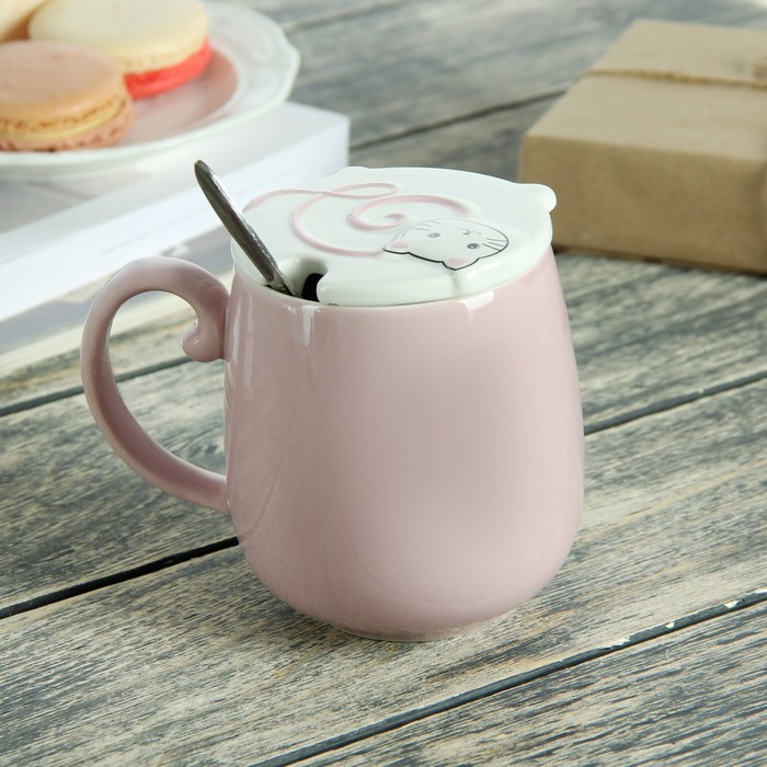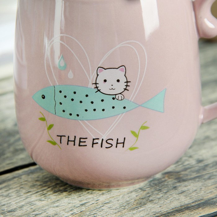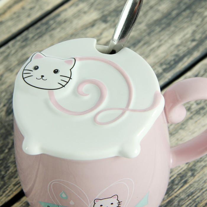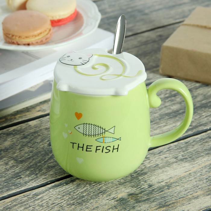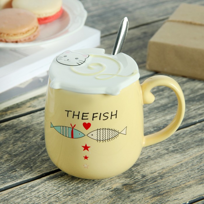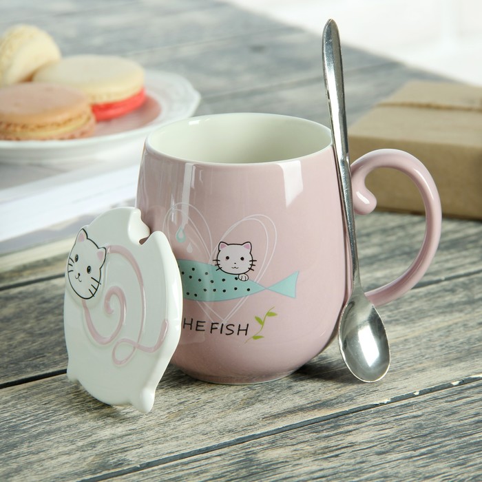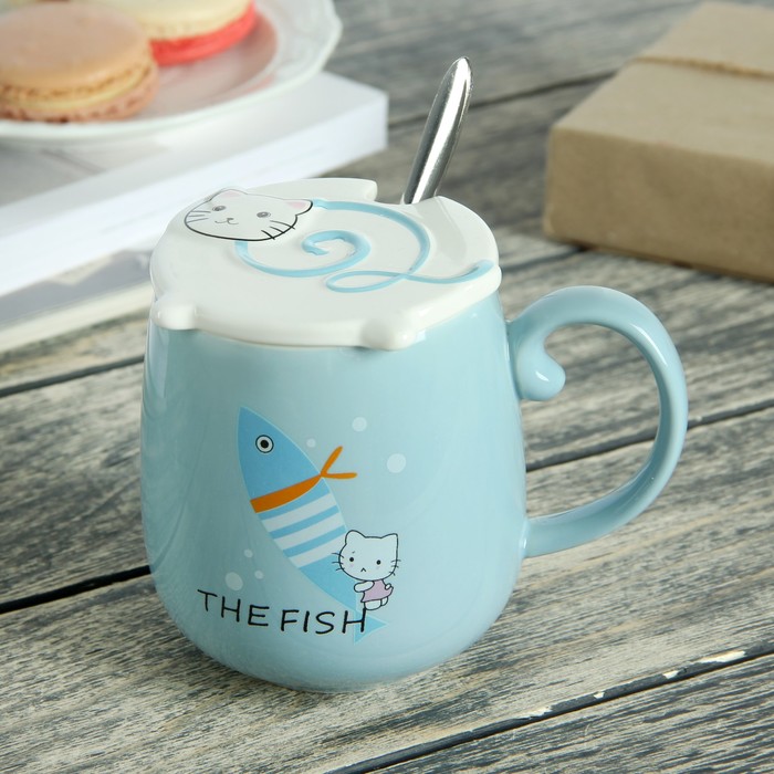 Кружка 400 мл "Кот и рыбка", с керамической крышкой и ложкой, рисунок и цвета МИКС