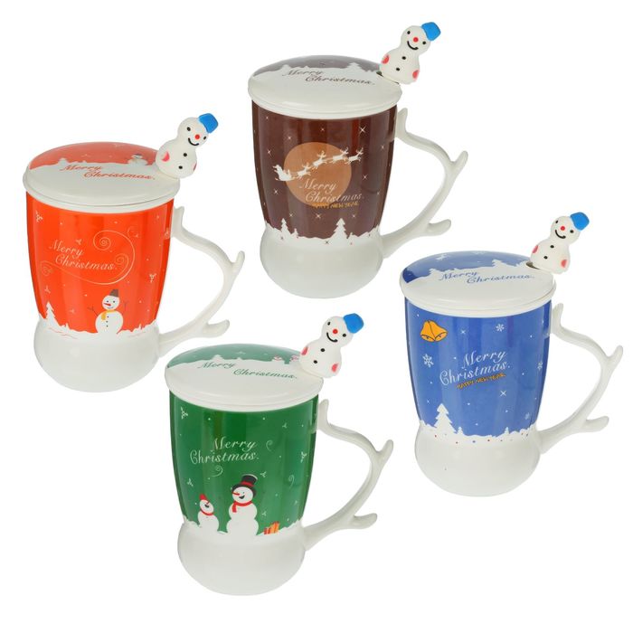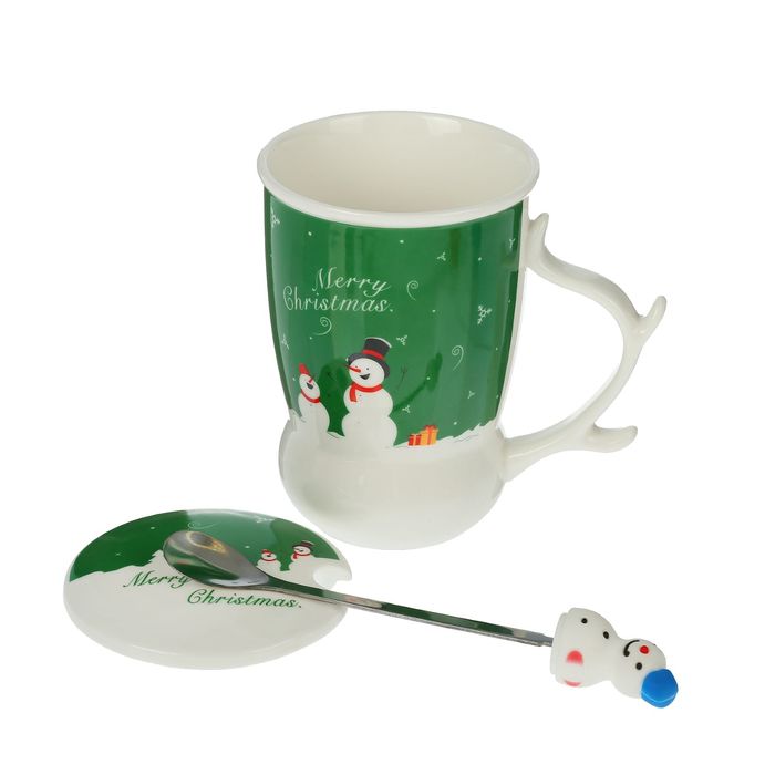 Кружка 450 мл "Снеговик", с керамической крышкой и ложкой, цвета МИКС
