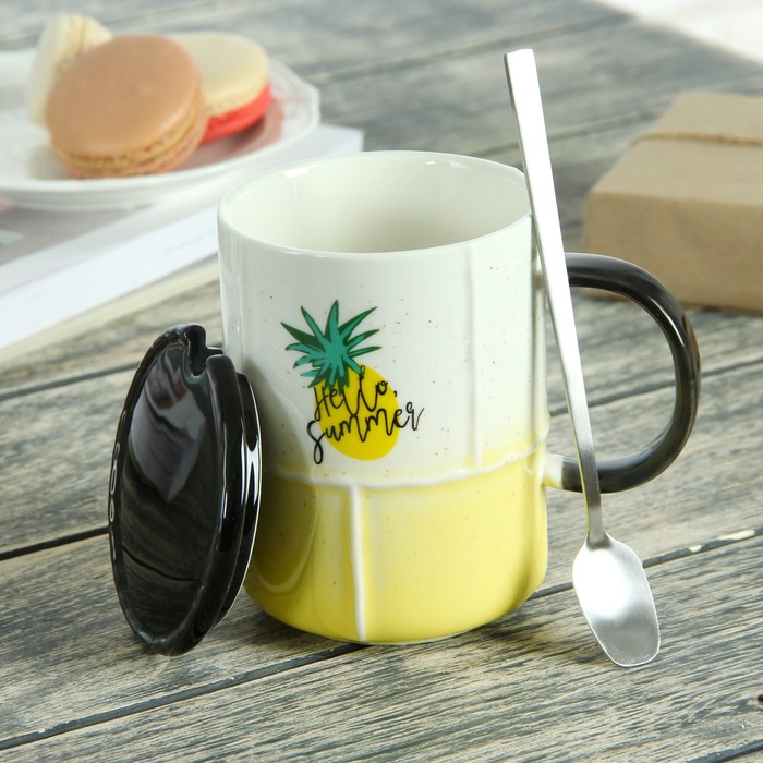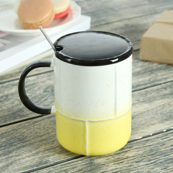 Кружка 480 мл "Цитрусы", с керамической крышкой и ложкой, рисунок и цвет МИКС